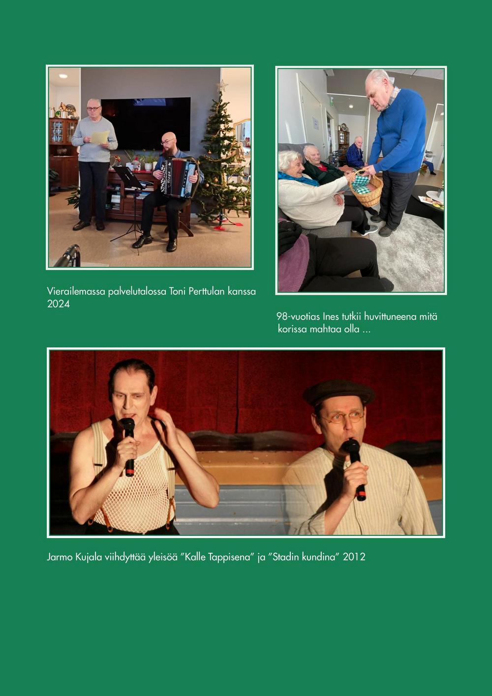 Esiinnyin ensimmäisen kerran Kemiön kunnalliskodissa vuonna 1975. Siitä lähtien olen vieraillut palvelutaloissa. Palvelutaloissa ohjelmaan ovat kuuluneet laulut, runot, tarinat ja muistokapsäkit.